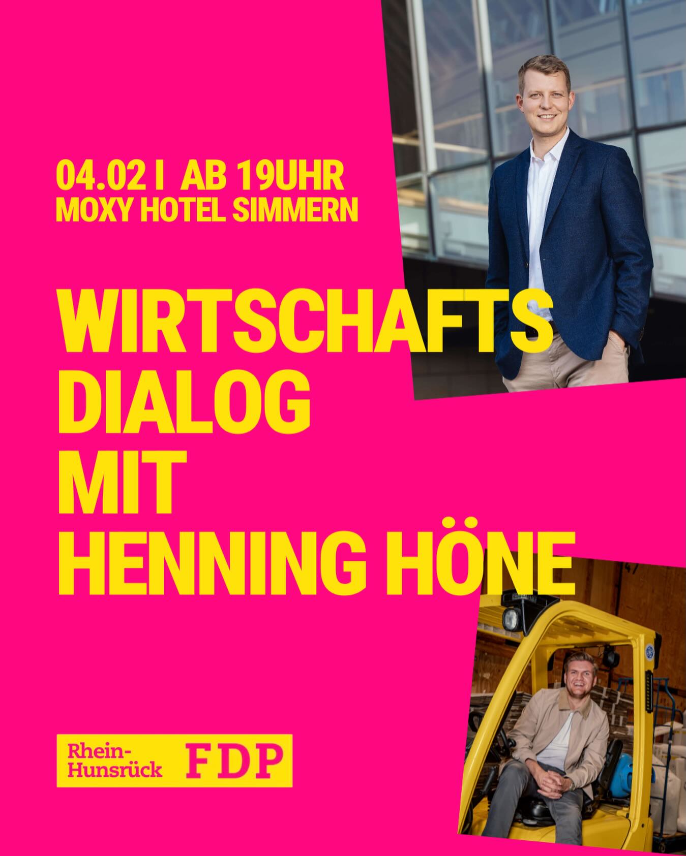 Wirtschaftsdialog mit Henning Höne MdL – stellvertretender FDP-Bundesvorsitzender Wir laden herzlich ein zum Wirtschaftsdialog mit Henning Höne MdL (@hhoene ) 👉 stellv. Bundesvorsitzender der FDP sowie Landes- und Fraktionsvorsitzender der FDP Nordrhein-Westfalen Gemeinsam mit unseren Mitgliedern, Unternehmerinnen und Unternehmern sowie wirtschaftlich Interessiertensprechen wir über: 🚀 Standortpolitik & 📈 Wettbewerbsfähigkeit in Deutschland 🏗️ Infrastruktur & Fachkräfte 🧾 Bürokratieabbau 🔓 Nachhaltiges Wirtschaften in herausfordernden Zeiten 🎤 Moderation: Fynn Stefan Klein (@fynnstefanklein ), Landtagskandidat der FDP Rhein-Hunsrück 📍 Moxy Hotel Simmern 🗓 4. Februar | 🕖 ab 19:00 Uhr Im Fokus steht der offene Austausch auf Augenhöhe – praxisnah, lösungsorientiert und ohne ideologische Scheuklappen. Genau so, wie ein Wirtschaftsdialog sein sollte. 🥂 Im Anschluss: Networking & Gespräche in entspannter Atmosphäre. 👉 Jetzt vormerken & gerne weiterleiten: https://kv-rhein-hunsrueck.freie-demokraten.de/termin/wirtschaftsdialog-mit-henning-hoene-mdl-stellvertretender-fpd-bundesvorsitzender Wir freuen uns auf einen starken Abend für Wirtschaft, Freiheit und Zukunft in Rhein& Hunsrück.